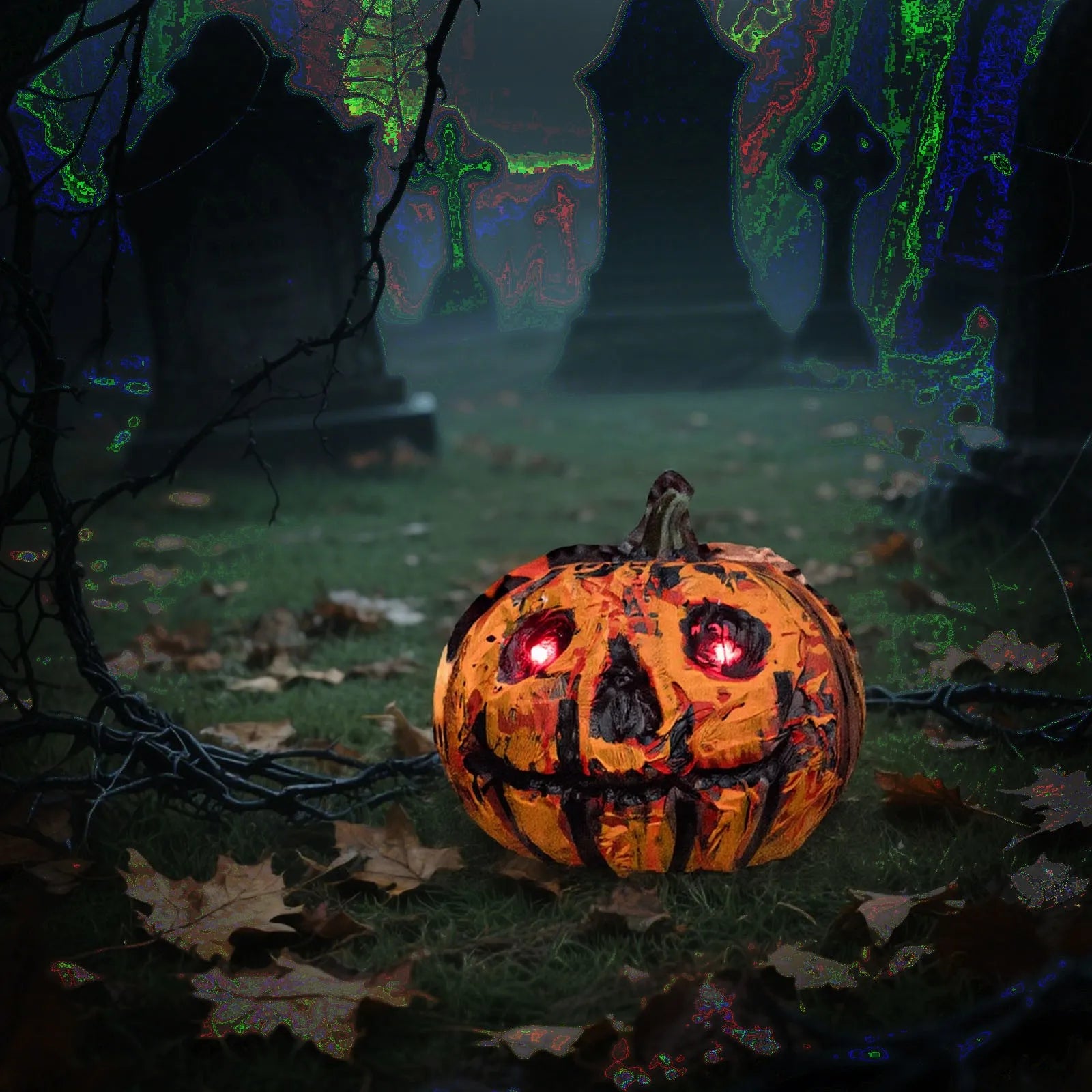 Halloween LED Light Up Sound Effect Vine Pumpkin Decor - Latex Scary O Head, Outdoor Waterproof Garden Prop)