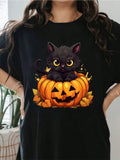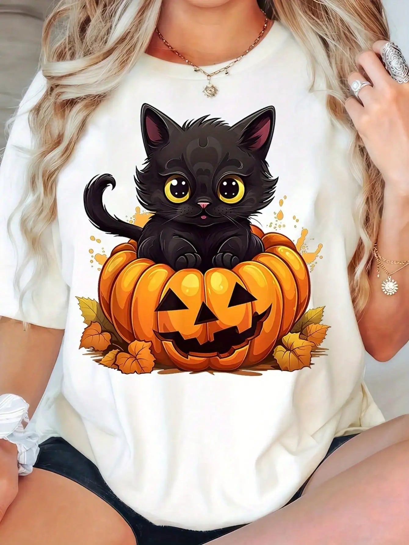 Halloween Black Cat & Pumpkin T-Shirt – Funny Spooky Print for Women