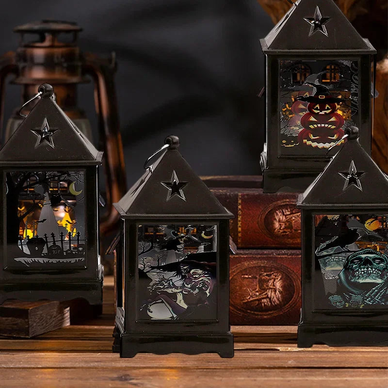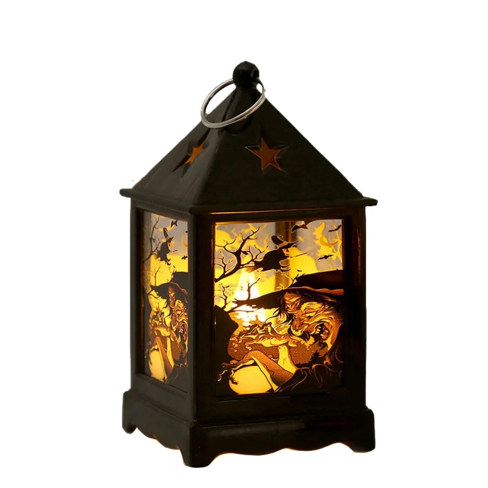 The desk light features a spooky Halloween theme with cartoon owl, pumpkin, witch, and crow patterns, perfect for creating a scary atmosphere.