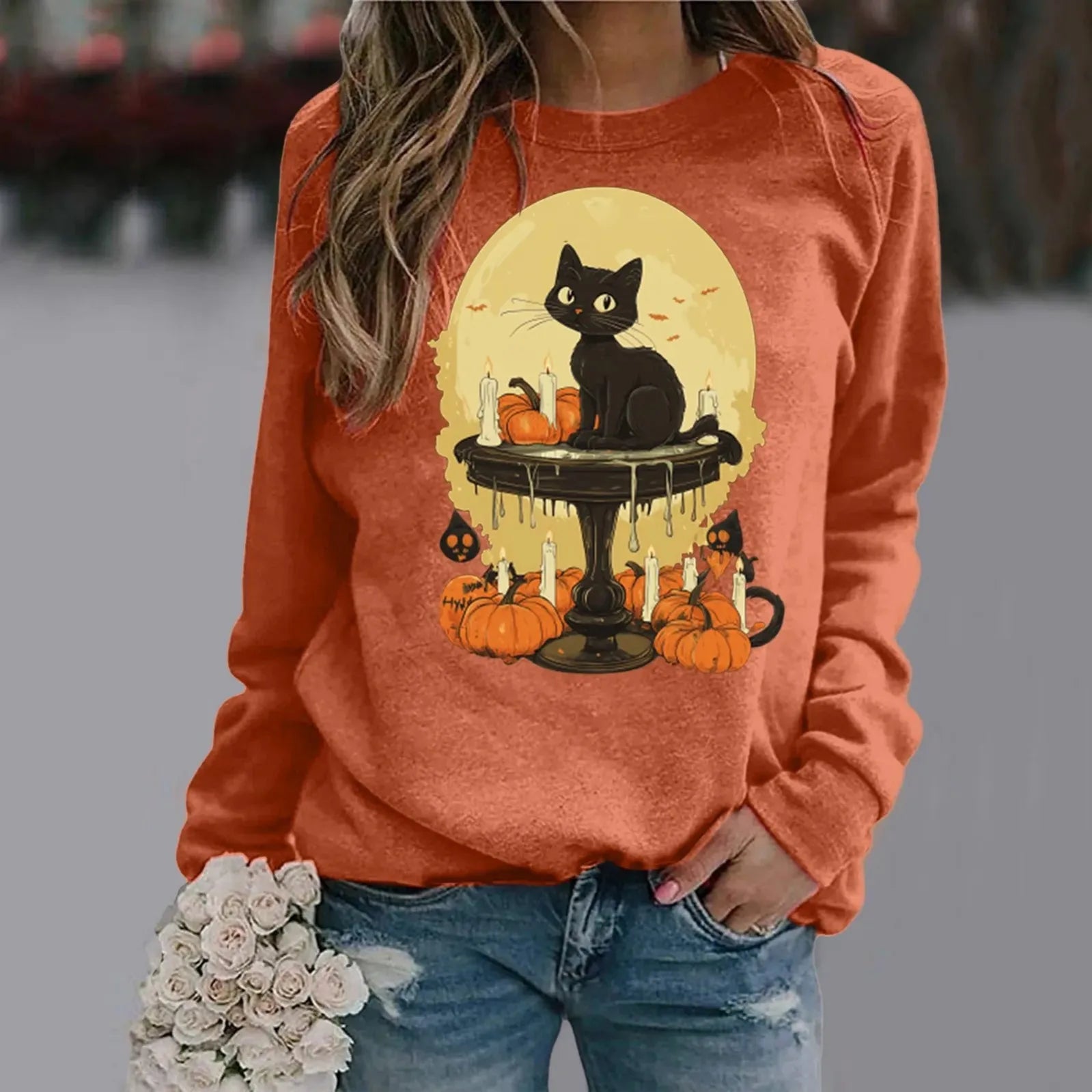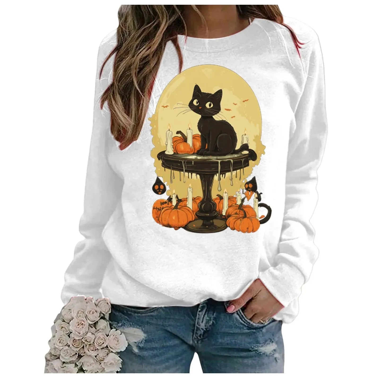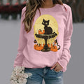 Women's Halloween Cat & Pumpkin Print Shirt – Long Sleeve Casual Hoodie Top